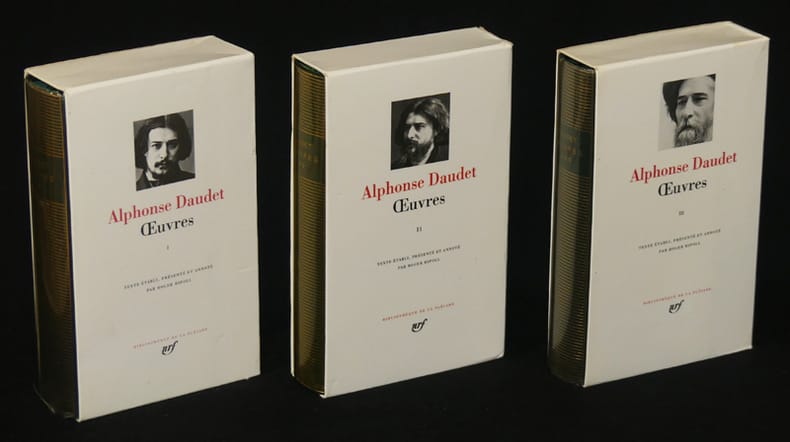 Gallimard Bibliothèque de la Pléiade Reliure d'éditeur 2001 Trois volumes in-12 (11 x 17,5 cm), reliures d'éditeur pleine peau sous rhodoïds et emboîtages illustrés d'un portrait, XXII-1726, 1512 et 1419 pages, Tome 1 (1986) : Le Petit Chose - Lettres de mon moulin - Lettres à un absent - Tartarin de Tarascon - Contes du lundi - Robert Helmont - Fromont jeune et Risler aîné - Appendices // Tome 2 (1990) : Jack - Le Nabab - Les Rois en exil - Appendices // Tome 3 (1994) : Numa Roumestan - L'Évangéliste - Sapho - Tartarin sur les Alpes - L'Immortel - Port-Tarascon - La Fédor - Le Trésor d'Arlatan, texte établi, présenté et annoté par Roger Ripoll ; étuis tachés, rhodoïds avec des traces de frottement, les livres en eux-même sont en très bel état. Livraison a domicile (La Poste) ou en Mondial Relay sur simple demande.