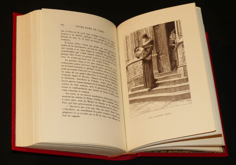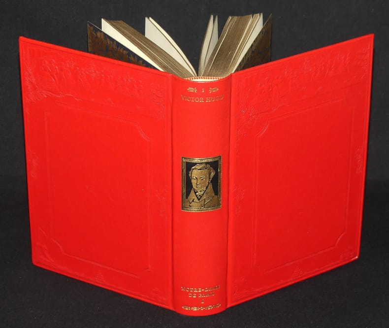 Paris, Jean de Bonnot 1974 40 volumes sur 43. In-8 31 x 13,5 cm. Reliures éditeur cuir rouge, titres dorés à l'or fin sur les dos, dos lisses avec report auteur et titre dorés, ornés du portrait de Victor Hugo, tête dorée, plats estampés d’un cadre à froid, 400 à 450 pages par volume, 2027 illustrations de l'époque de l'auteur, table. Exemplaires en bon état.