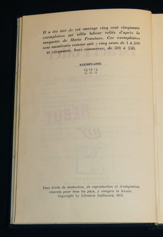 Gallimard Les Cartonnages NRF Reliure d'éditeur 1956 In-8 couronne, cartonnage décoré de l'éditeur d'après une maquette de Mario Prassinos, 286 pp., 1 des 550 sur Vélin, Édition originale de la traduction de Francis Ledoux ; Tampon de la bibliothèque centrale de prêt, scotch sur les gardes, cartonnage en bel état. Livraison a domicile (La Poste) ou en Mondial Relay sur simple demande.
