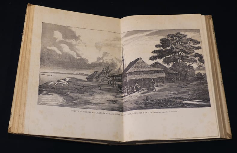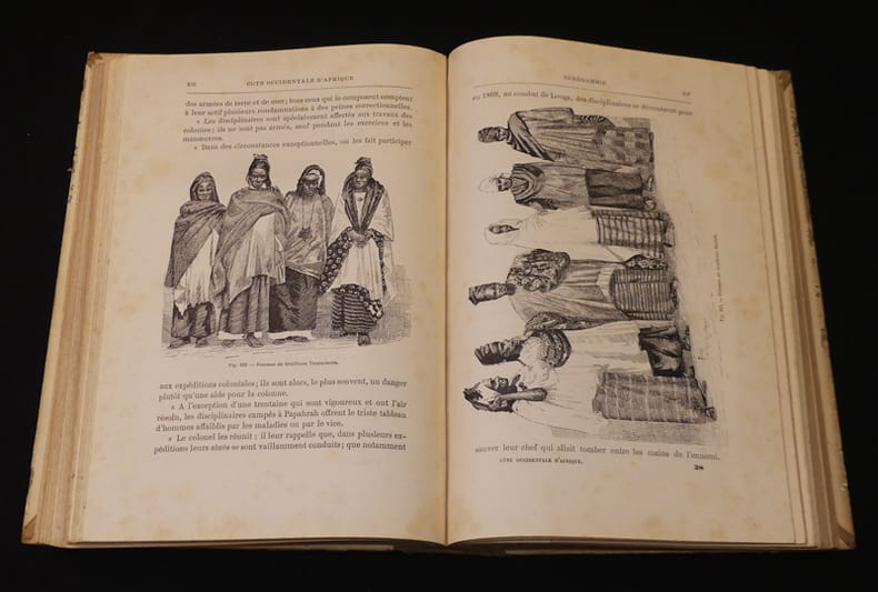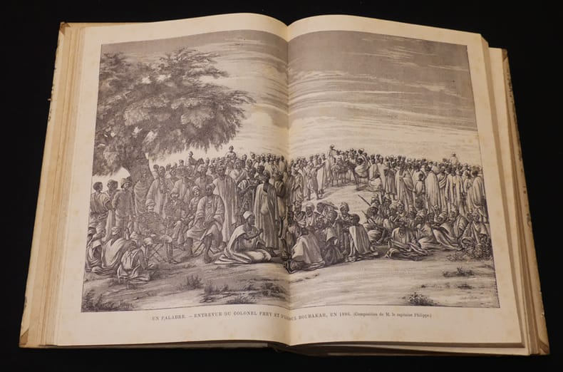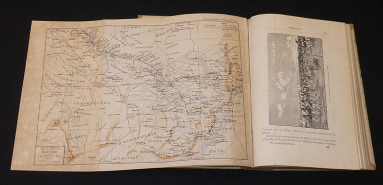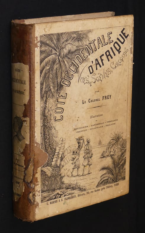 Sahara - Soudan -Sénégambie - Dakar et Gorée - Libéria - Sierra Leone - Guiné - Côte d'Or - Cameroun - Gabon Maroc - Îles Canaries - îles du Cap-Vert Cartonnage polychrome de l'éditeur pleine percaline rouge, 27x19cm, dos lisse orné d'une composition dorée, usures d'usages, premier plat orné d'une plaque polychrome signée Paul Souze, tranches dorées, 543 pp., 294 figures, 65 planches hors texte de Bretegnier, Darondeau, Fernando, Jeanniot, Nousveaux, Philippe, 4 cartes tirées en couleurs. Paris, Marpon et Flammarion, 1890