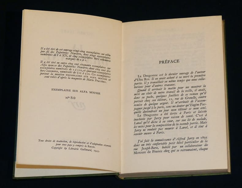 Paris, 1965, in-8, 136 pp, agrafé, couverture noire aux décors et titres dorés, Exemplaire enrichi d'un envoi de Maurice Saillet, satrape du collège de pataphysique, à Jean le Marchand. Ouvrage contenant de nombreuses illustrations, fac-similés et un important dossier, éclairant le texte de Jarry "La dragonne", avec des articles de Maurice Saillet. "Remarquable dossier consacré à Jarry, permettant une lecture plus cohérente de la 'Dragonne" (Goudemare, 190). Bel exemplaire, complet in fine du feuillet de souscriptions, du bandeau de l'éditeur et de la feuille de présentation des dossiers du collège de pataphysique. Couverture rigide
