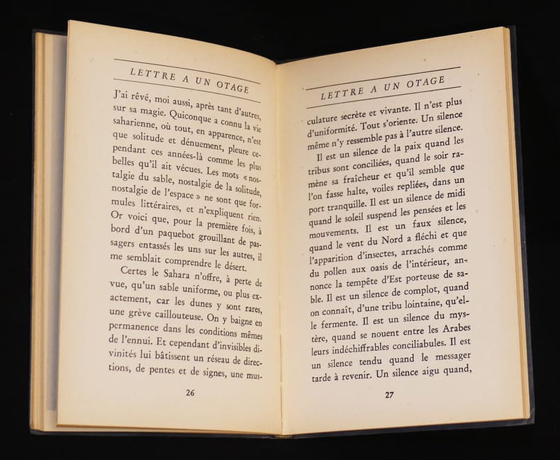 Lettre à un otage : Rare édition originale. Un des 120 exemplaires numérotés sur papier Corsican, seul tirage en grand papier. N° 92. JOINT : Lettres de jeunesse 1923-1931. Préface de Renée de Saussine. Paris, Gallimard, 9 mars 1953. In-12, broché, 150 pp-[1], non coupé. Édition originale. Un des 320 ex n° sur vélin pur fil Lafuma-Navarre. Ces deux ouvrages sont réunis sous la même chemise et étui dos en maroquin pièce de titre en chagrin rouge.EXEMPLAIRES EN PARFAIT ÉTAT. Photos sur demande.
