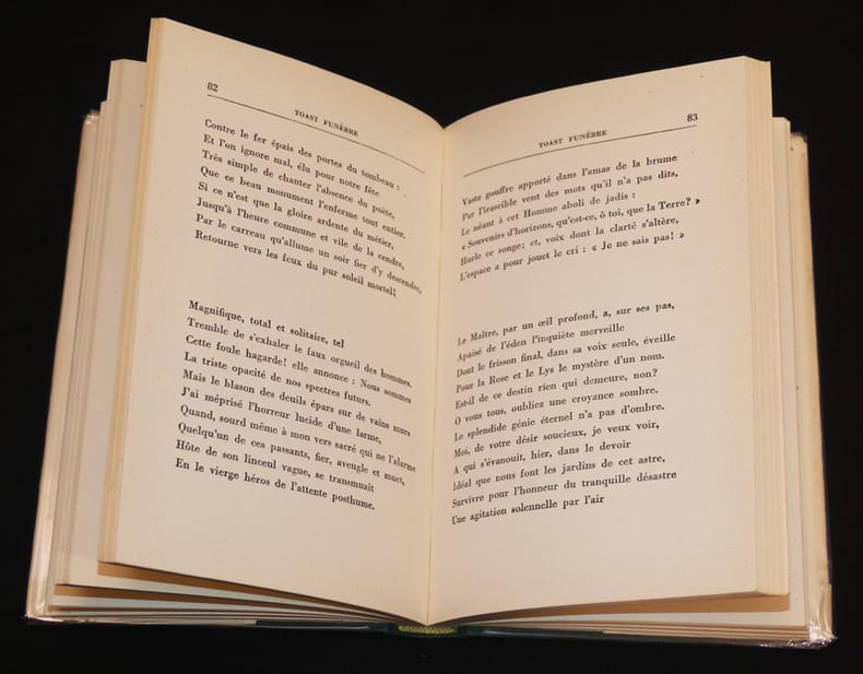 Gallimard NRF "Bibliothèque De La Pléiade", 1980. 1 volume in-12 relié (17,5 x 11 cm), reliure éditeur plein cuir vert, dos lisse orné de filets dorés, jaquette blanche imprimée, rhodoïd, étui de carton gris de l'éditeur, 976 pages -Édition de Maurice Allem. Ce volume contient : Premières poésies - Poésies nouvelles - Poésies complémentaires - Fragments de poésies inachevées - Poésies attribuées à Musset.. Très bon état.