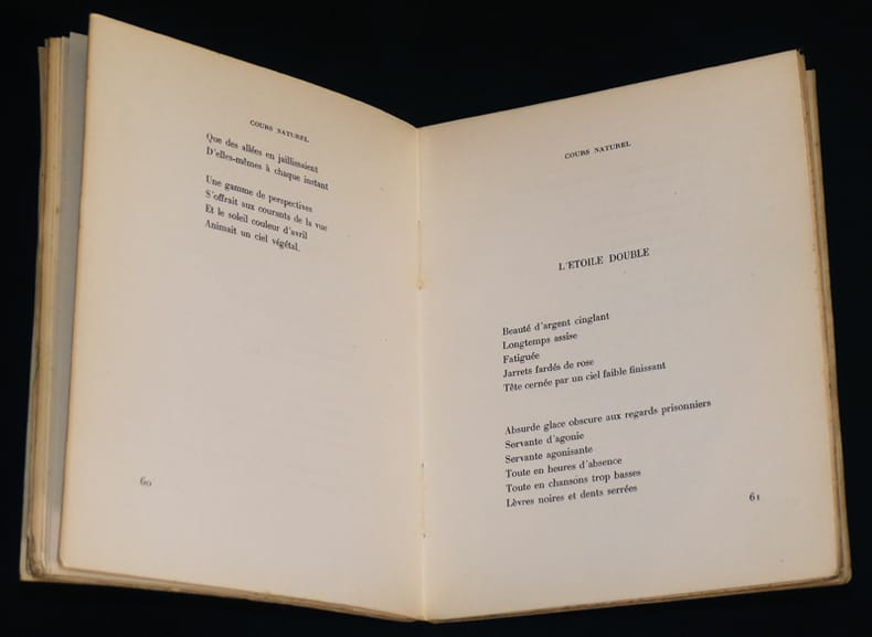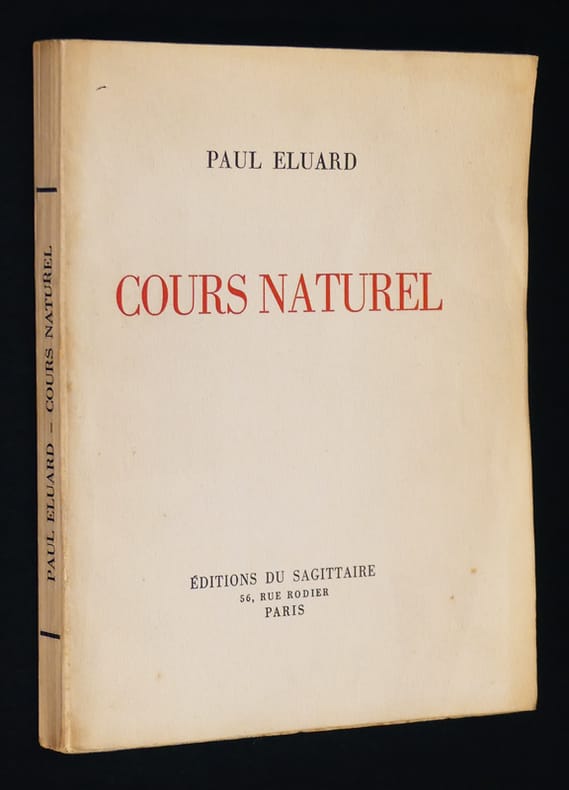 Paris, Éditions du Sagittaire, 1938. Un volume in-8 carré (197 x 157 mm), 118 pages, couverture imprimée. Reliure : maroquin janséniste citron, dos lisse titré or, encadrement intérieur de maroquin citron orné de quadruples filets dorés, doublures et gardes de soie moirée bleue, tête dorée, non rogné, couverture et dos conservés, étui bordé (Louis Christy). Édition originale de ces poèmes : elle est dédiée à Nusch Éluard. Précieux exemplaire de Roger Lacourière, justifié HC, du tirage de SP sur vélin fort, comportant un envoi autographe signé de Paul Éluard sur le faux-titre à Roger Lacourière dont le nom a été soigneusement effacé mais encore aisément lisible. Il est accompagné en frontispice DE LA RARISSIME EAU-FORTE ORIGINALE DE SAVADOR DALI TIRÉE SUR CHINE réservée aux 5 premiers exemplaires sur Chine, signée par Dali dans la planche. L'épreuve est annotée « Bon à tirer » au crayon. L'exemplaire est enrichi d'UN ÉTAT SUPPLÉMENTAIRE DE LA GRAVURE tirée sur vélin fort. Il s’agit visiblement d’un tirage d’essai, probablement unique, avant la signature gravée et l'aciérage de la plaque, on y distingue une trace de doigt à l’angle inférieur gauche et des taches d'encre en coin inférieur droit faites à l’impression. Roger Lacourière imprimait à cette époque les gravures de Dali, mais également de Picasso, Miro et d'autres artistes surréalistes dont il était proche. Ne soyons pas étonnés qu'il ait donc demandé à Louis Christy de relier son exemplaire. Louis Christy, mort en 1940, était, nous le savons, l’un des relieurs attitrés des écrivains surréalistes, dont Éluard et Breton, ayant réalisé notamment des reliures d’après des maquettes de Georges Hugnet. On trouve aussi un second état sur Chine du feuillet de titre et, ajouté en tête, le prière d’insérer de l’ouvrage, monté sur onglet.