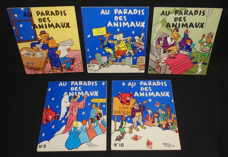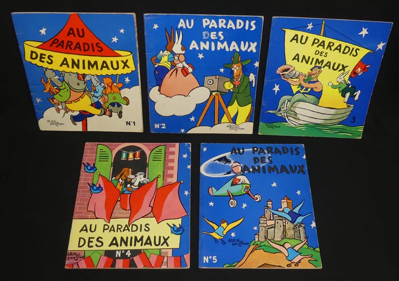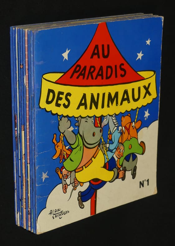 Chavane Au Paradis des Animaux Album souple 1956 10 volumes in-8 carré (23 x 20 cm.), plats illustrés (la vache qui rit au 4° plat), 23 pages pour chaque volume, illustrations couleurs dans le texte ; menus incidents au dos et aux bords, bel ensemble, bien complet de tous les volumes.. Livraison a domicile (La Poste) ou en Mondial Relay sur simple demande.