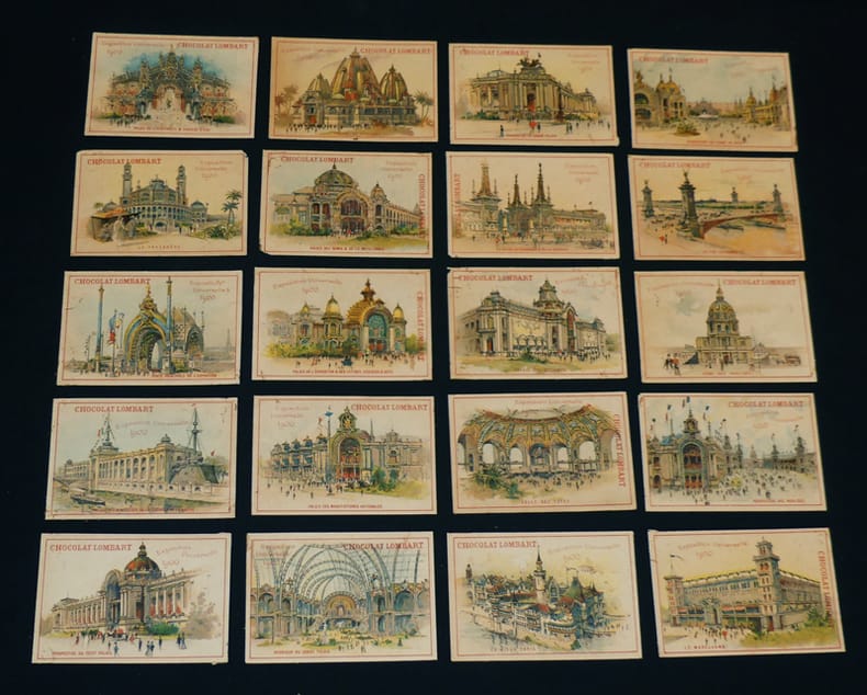 Chocolat Lombart Chromolithographie Lot de 20 chromos 10 x 7 cm éditées par le Chocolat Lombart, représentant des vues de l'Exposition Universelle de 1900 ; quelques petites rousseurs, résidus de colle dans les coins au dos des chromos, par ailleurs bon état. Livraison a domicile (La Poste) ou en Mondial Relay sur simple demande.
