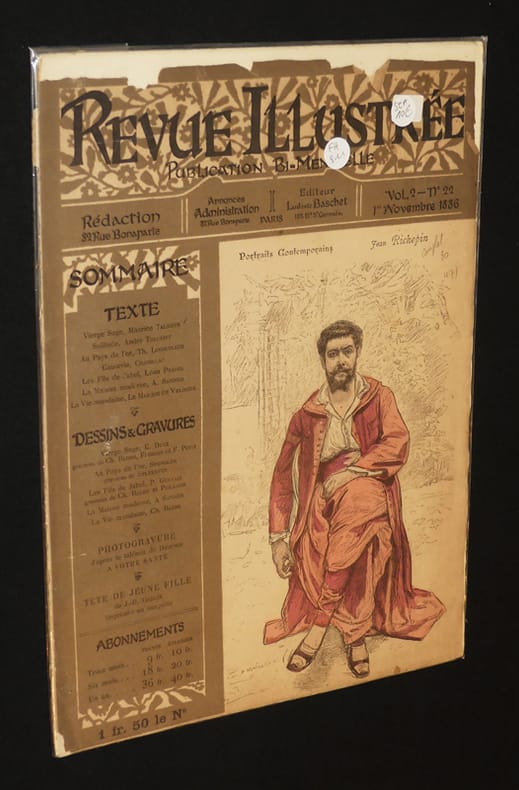 Baschet Ludovic Revue illustrée Broché 1886 "In-4 (24.5x32 cm), broché, couverture illustrée, volume 2, n°22 de la publication bi-mensuelle ""Revue illustrée"", 1er novembre 1886, portraits contemporains, textes de Maurice Talmeyr, André Theuriet, Th. Lindenlaub, Chamillac, Léon Pradel, A. Sandier, Le Masque de Velours, dessins et gravures de E. Duez, Baudé, Florian, F. Petit, Spengler, Sylverster, P. Gervais, Paillard, A. Sandier, une photogravure d'après le tableau de Domingo ""A votre santé"", une tête de jeune fille de J.-B. Creuze imprimée en sanguine ; dos usé et fendu sur la quasi totalité de la longueur, manque papier en tête de 1er plat (toute la largeur) et au coin supérieur du 1er plat, quelques rousseurs, état correct. Livraison a domicile (La Poste) ou en Mondial Relay sur simple demande."