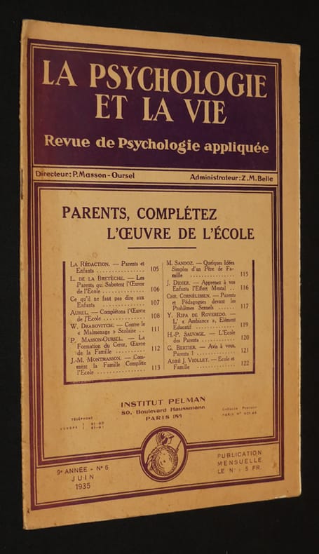 Institut Pelman La psychologie et la vie Brochure 1935 In-4 (18.5x28 cm), brochure, 106-124 pp., ouvrage collectif ; coiffes frottées, quelques rousseurs, volume jauni, bon état. Livraison a domicile (La Poste) ou en Mondial Relay sur simple demande.
