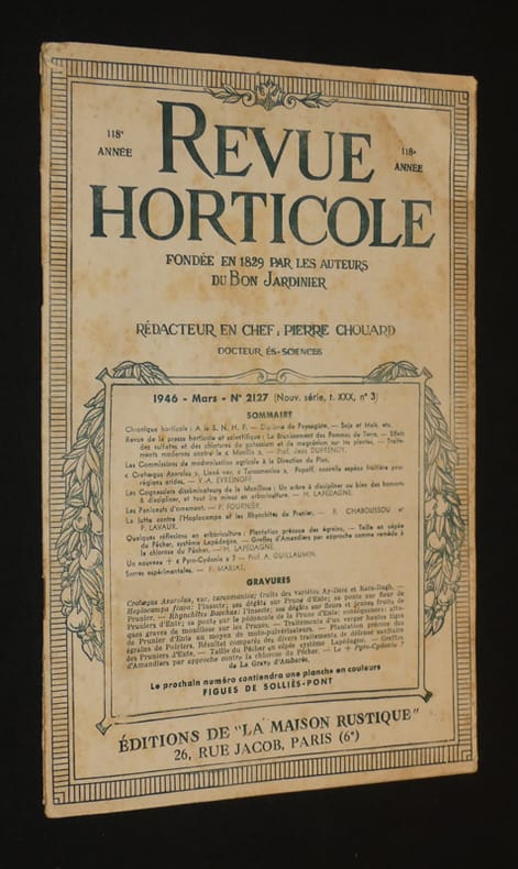 Editions de la maison rustique Revue horticole Brochure 1946 In-4 (18.5x27 cm), brochure, 42 à 56 pp., n°2127 de la 'Revue horticole', mars 1946 ; dos frotté et déchiré aux coiffes et aux agrafes, rousseurs sur les plats, pliures au coin supérieur du er plat, assez bon état. Livraison a domicile (La Poste) ou en Mondial Relay sur simple demande.