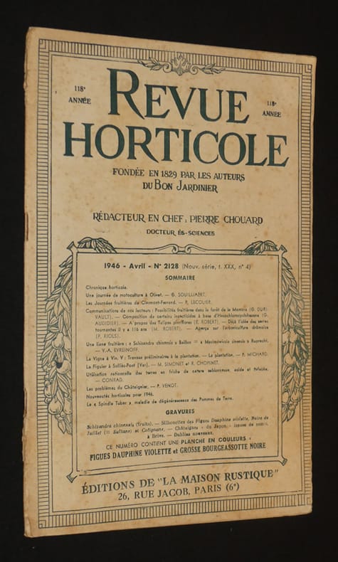 Editions de la maison rustique Revue horticole Brochure 1946 In-4 (18.5x27 cm), brochure, 58 à 74 pp., n°2128 de la 'Revue horticole', avril 1946 ; dos frotté et déchiré à la coiffe supérieure et à une agrafe, rousseurs sur les plats, bon état. Livraison a domicile (La Poste) ou en Mondial Relay sur simple demande.
