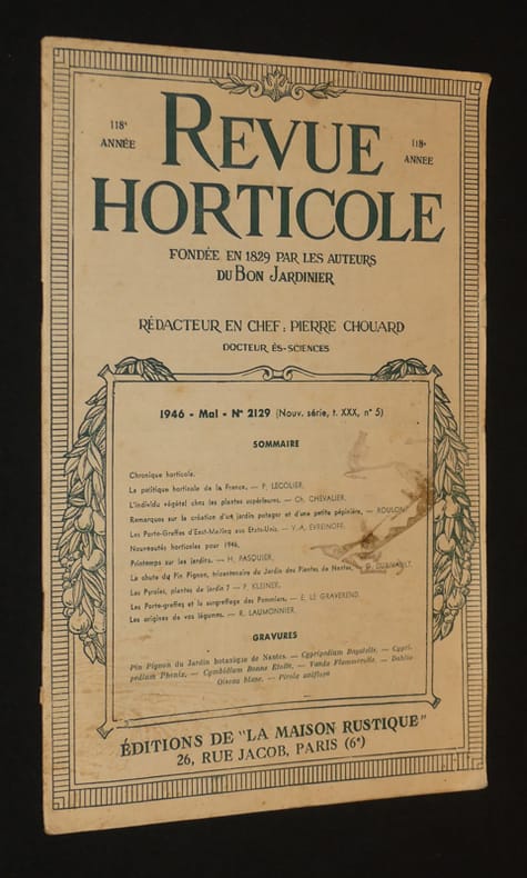 Editions de la maison rustique Revue horticole Brochure 1946 In-4 (18.5x27 cm), brochure, 76 à 92 pp., n°2129 de la 'Revue horticole', mai 1946 ; quelques pâles rousseurs sur les plats, 1er plat un peu sali, bon état. Livraison a domicile (La Poste) ou en Mondial Relay sur simple demande.