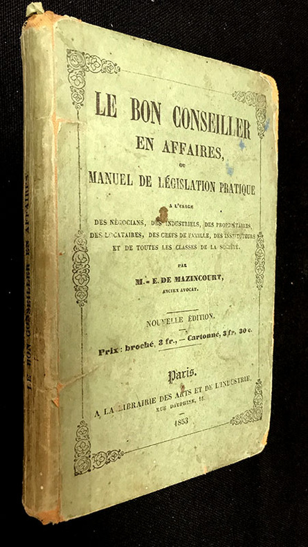 Librairie des arts et de l'industrie Cartonné 1853 In-12 (11 x 18 cm), cartonné, 312 pages, ouvrage à l'usage des négociants, des industriels, des propriétaires, des locataires, des chefs de famille, des instituteurs et de toutes les classes de la société, nouvelle édition, bien complet du tableau des barèmes dépliant en fin d'ouvrage ; pliures au dos, coiffes, mors et coupes frottées, des marques d'usage à la couverture, quelques rousseurs, tampon à la page de titre, état correct. Livraison a domicile (La Poste) ou en Mondial Relay sur simple demande.