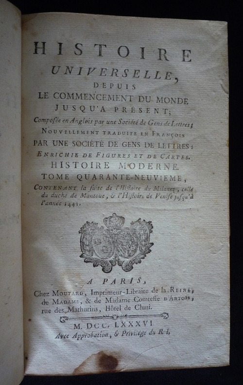 Moutard, imprimeur libraire de la Reine Reliure d'éditeur 1786 In-8 (20,5 x 13,5 cm), demi-basane, paginé vj-xxviij et 2-560, tranches rouges ; tome quarante-neuvième contenant la suite de l'Histoire du Milanez, celle du duché de Mantoue, & l'Histoire de Venise jusqu'à l'année 1441 ; mors supérieur et coiffes frottés, quelques rousseurs et salissures à l'intérieur, bon état général. Livraison a domicile (La Poste) ou en Mondial Relay sur simple demande.