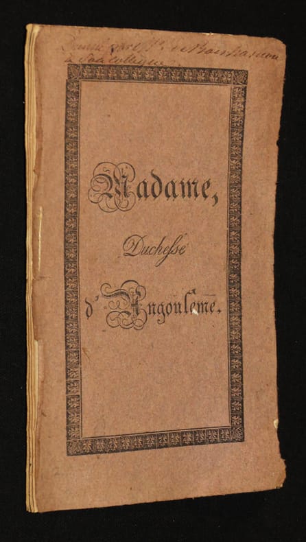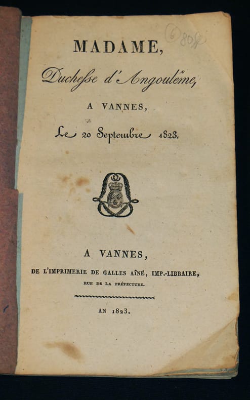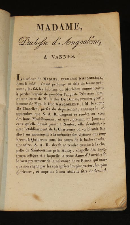 28 pp., annotation manuscrite de l'époque au bas de la p. 12 (sur l'acquisition du "champ des martyrs").Aucun exemplaire au CCF. Très rare compte-rendu de la visite officielle rendue par la duchesse d'Angoulême à la préfecture du Morbihan, après sa longue tournée dans les départements du Midi