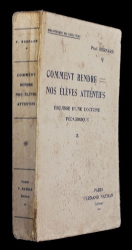 Nathan Fernand Bibliothèque des éducateurs Broché 1933 "In-12 (12x19 cm), broché, 334 pages, nouvelle édition (anciennement ""L'Ecole attentive"") ; pliures au dos usé, coiffes frottées, mors supérieur fendus aux coiffes, rousseurs sur les plats et à l'intérieur, état correct. Livraison a domicile (La Poste) ou en Mondial Relay sur simple demande."
