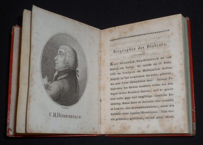 Aachen, F. W. Forstmann Cartonné 1815 "In-18 (18,5 x 10 cm), cartonné, XVI-143 pages, poésie en allemand, tome 15 de la série ""Etui-Bibliothek der deutschen Classiker"", avec un portrait de Heydenreich par Gottschik en frontispice, et une courte biographie en début d'ouvrage ; page de titre manquante, coiffes et coins frottés, assez bon état général. Livraison a domicile (La Poste) ou en Mondial Relay sur simple demande."
