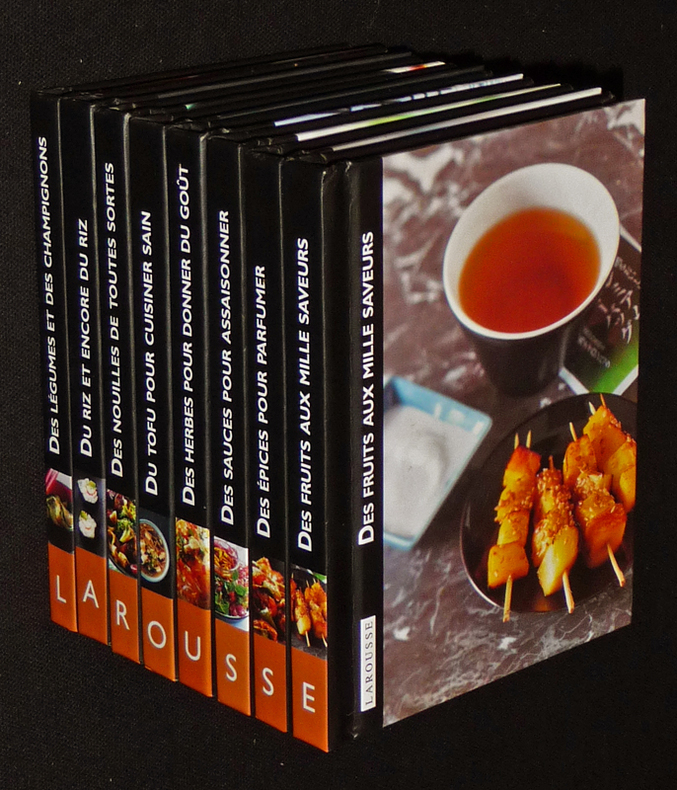 Larousse Ma petite épicerie exotique Cartonné 2013 "Huit volumes in-12 (9,8 x 12,7 cm), cartonnés (sans le coffret), 54 pages par volume, série ""Ma petite épicerie exotique"" complète : Des légumes et des champignons - Du riz et encore du riz - Des nouilles de toutes sortes - Du tofu pour cuisiner sain - Des herbes pour donner du goût - Des sauces pour assaisonner - Des épices pour parfumer - Des fruits aux mille saveurs ; quelques marques de frottement sur les plats, par ailleurs très bon état général. Livraison a domicile (La Poste) ou en Mondial Relay sur simple demande."