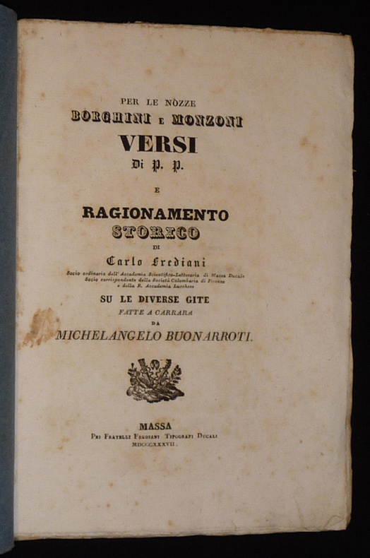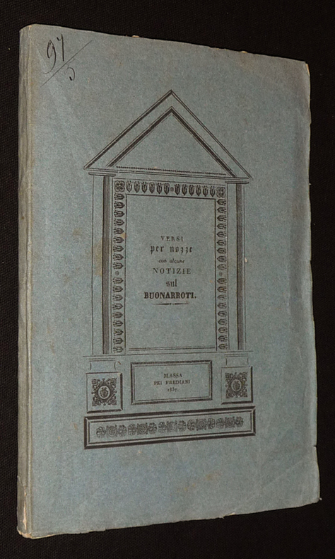 Massa, pei Fratelli Frediani, Tipografi Ducali Broché 1837 In-8 (14,7 x 21,5 cm), broché, 97 pages, texte en italien ; coin inférieur du premier plat corné, petite mouillure dans la marge en début et fin de volume, quelques rousseurs éparses, mors supérieur légèrement fendu en queue, assez bon état. Livraison a domicile (La Poste) ou en Mondial Relay sur simple demande.