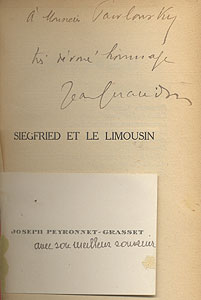 Edition originale. Un des exemplaires du tirage numéroté du tirage sur vergé bouffant. Il est ici revêtu d'une délicate reliure du temps de demi-maroquin (qui eût méritée d'être signée). ''Dans Siegfried et le Limousin, j'ai raconté l'histoire d'un Français privé de la mémoire par une blessure reçue à la guerre, rééduqué sous le nom de Siegfried par ceux qui l'ont recueilli dans une nation et des mœurs qui ne sont pas les siennes, et ramené par des amis à son ancienne vie. Le roman a pour but d'apporter dans chaque cœur de lecteur, à domicile, par une douce pression, un balancement à l'imagination ou à la délectation sentimentale.'' Papier très légèrement oxydé. Du reste, très belle condition.