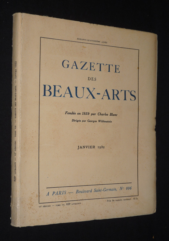 Gazette des Beaux-Arts Revue 1932 In-4 (23 x 28,5 cm), revue brochée, introduction en anglais (XLVI pages) puis 106 pages, illustrations en noir et blanc ; dos de biais, mors frottés, petite réparation au ruban ashésif au mors supérieur en queue, rousseurs au premier plat, par ailleurs intérieur frais, assez bon état. Livraison a domicile (La Poste) ou en Mondial Relay sur simple demande.
