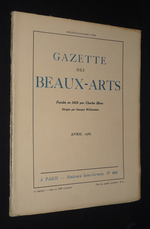Gazette des Beaux-Arts Revue 1932 In-4 (23 x 28,5 cm), revue brochée, paginée de 238 à 300, puis résumé en anglais in fine, illustrations en noir et blanc ; mors frottés, par ailleurs assez bel état général. Livraison a domicile (La Poste) ou en Mondial Relay sur simple demande.