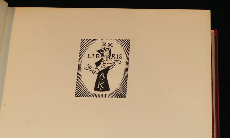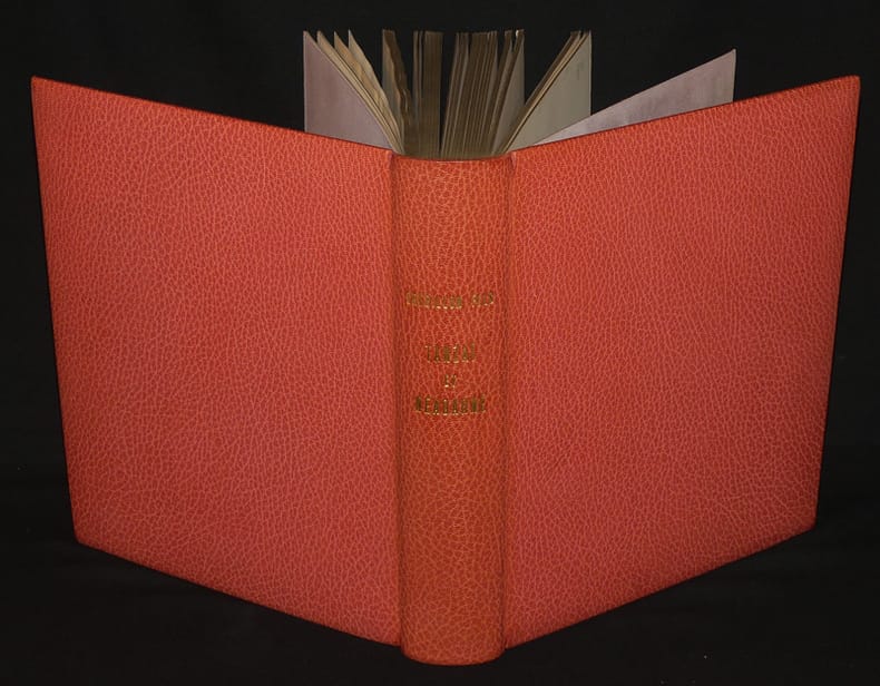 Paris ERYX 1950 In-8, plein maroquin rouge, compositions mosaïquées de cuir rose, vert et bleu et d’étoiles or, dos lisse, couvertures et dos conservés, page de garde de soie rouge, doublure demi-chagrin rouge à bandes infime accroc au dos, étui bordé signée R. Marchal, 166 pp. 15 compositions dans le texte en couleurs. Dos du portefeuille insolé. Bel exemplaire.
