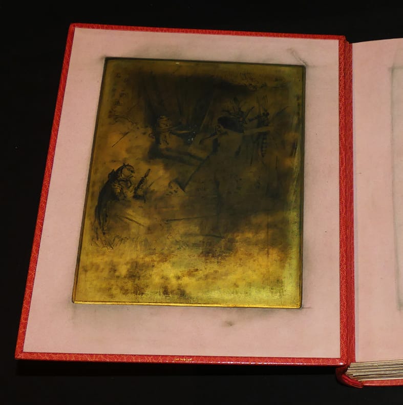Eryx Reliure signée 0 "In-4 de maroquin ocre janséniste, sous chemise et emboitage, tranches dorées, doublure en velours rose avec un cuivre original, ayant servi à l'illustration, doré et encré, couverture et dos conservés, reliure signée JP Miguet, un des 15 exemplaires sur papier vélin d'Arches, contenant deux suites, une en noir et une en sanguine avec remarques, illustré de 15 pointes sèches originales de Bécat, imprimées en couleurs, notre exemplaire possède, en plus du cuivre doré et encré, une pointe sèche originale ainsi qu'un envoi de Bécat ""En toute sympathie. P. Emile Bécat"", également présent un bon à tirer, lui aussi signé par Bécat, et une aquarelle originale signée par Bécat, ex-libris prestigieux (Aga-Khan), sans date ; emboitage très lègèrement fendu, très bel exemplaire, en parfait état.. Livraison a domicile (La Poste) ou en Mondial Relay sur simple demande."