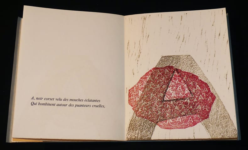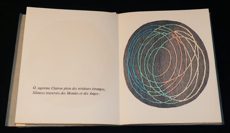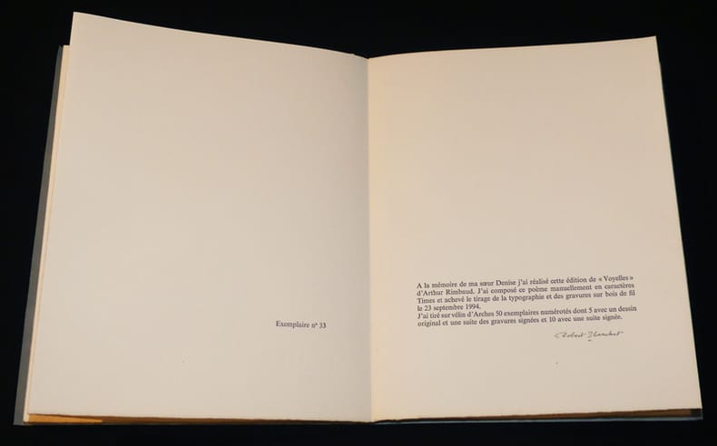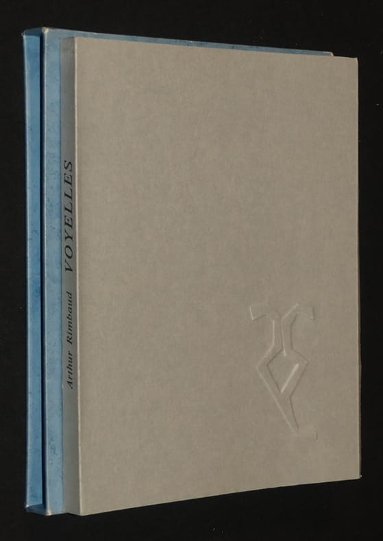 S.l., par l’imprimeur-typographe Jean Berling, s.d. 4 volumes à spirales 13 x 16 cm imbriqués, dans une boîte cartonnée en papier bleu 17 x 22 cm. Boîte légèrement frottée, très bon état intérieur. Édition originale de ce livre-objet proposant une image multiple du poème Voyelles d’Arthur Rimbaud, tirage limité à 200 exemplaires numérotés, celui-ci est un des 100 réservés aux amis de Pierre Duplan. Il est signé par l’auteur et l’imprimeur au colophon. Bien complet du poème originel imprimé sur un feuillet libre.
