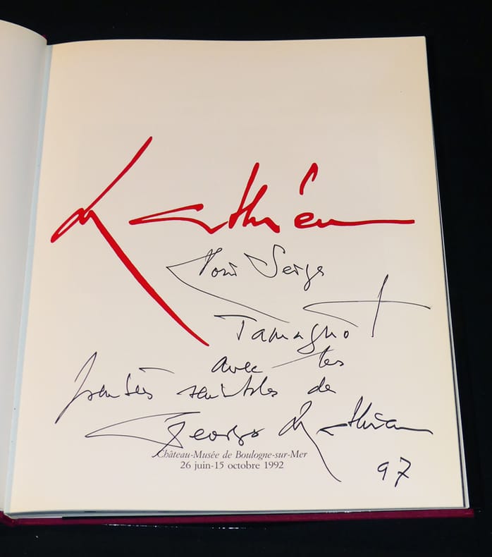 Château-Musée de Boulogne-sur-Mer Cartonné avec jaquette 1992 In-4 (24,5 x 31,6 cm), cartonné sous jaquette illustrée, 117 pages, hommage à Georges Mathieu avec des textes de Annie Wable, Françoise Poiret et Patrick Grainville, reproductions en couleurs, ENVOI SIGNE ET DATE DE GEORGES MATHIEU ; petites traces aux gardes, légers frottements au quatrième plat de la jaquette, par ailleurs très bel exemplaire. Livraison a domicile (La Poste) ou en Mondial Relay sur simple demande.