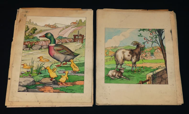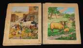 Capendu A. Planches 1944 25 PLANCHES ORIGINALES. EXEMPLAIRE UNIQUE. ABC des Bêtes en Famille. A. Capendu, 1944. Ensemble complet des 25 planches d'illustrations originales de A. Douet pour l'abécédaire qui portera le titre 'ABC des animaux domestiques', comprenant les deux couvertures (26,2 x 31,7 cm et 25,5 x 32,8 cm, premier plat illustré d'un Ane, d'un Boeuf et d'une Chèvre sur fort carton de réemploi, quatrième plat illustré de trois chats) et 23 planches en couleurs sur papier d'Arches de différentes provenances, un dessin sur deux est plus petit afin de laisser la place en marge inférieure pour le futur texte, annotations de couleurs en marges ; quelques défauts, voir photos, bon état. Livraison a domicile (La Poste) ou en Mondial Relay sur simple demande.