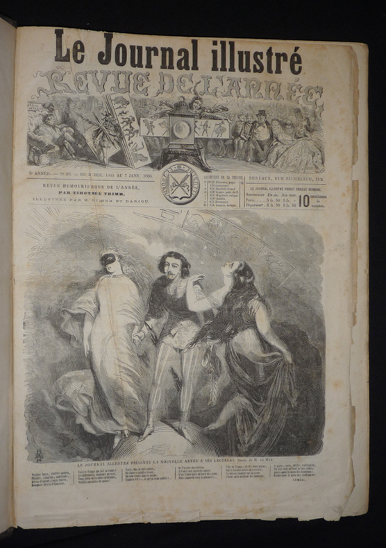 Le journal illustré Revue relié 1867 "In-folio (29,5 x 39,5 cm), reliure demi peau, 400 pages, n°99 (3 décembre 1866) à 200 (8 décembre 1867) du ""Journal illustré"", hebdomadaire d'actualités paru de 1864 à 1899, auquel ont contribué entre autres Gustave Doré, Cham, Maurice Sand, etc. ; coupes et coins usés, quelques marques de frottement sur les plats, bon état général. Livraison a domicile (La Poste) ou en Mondial Relay sur simple demande."