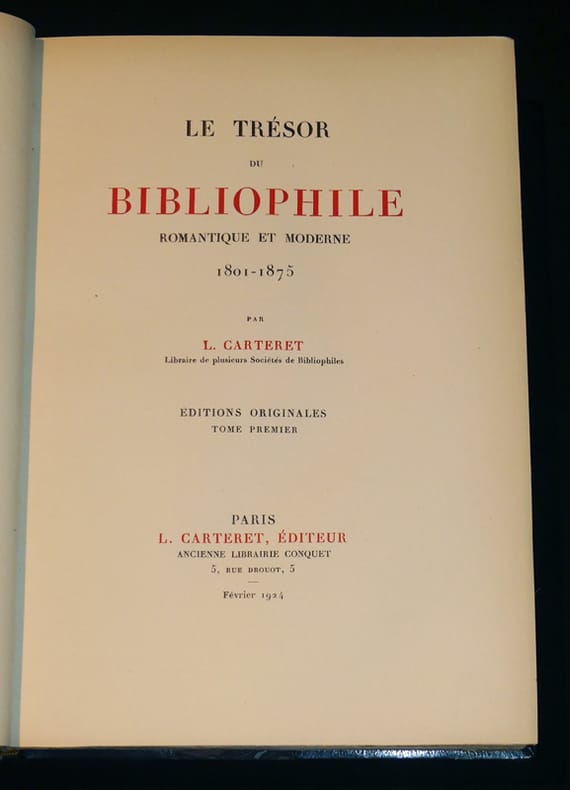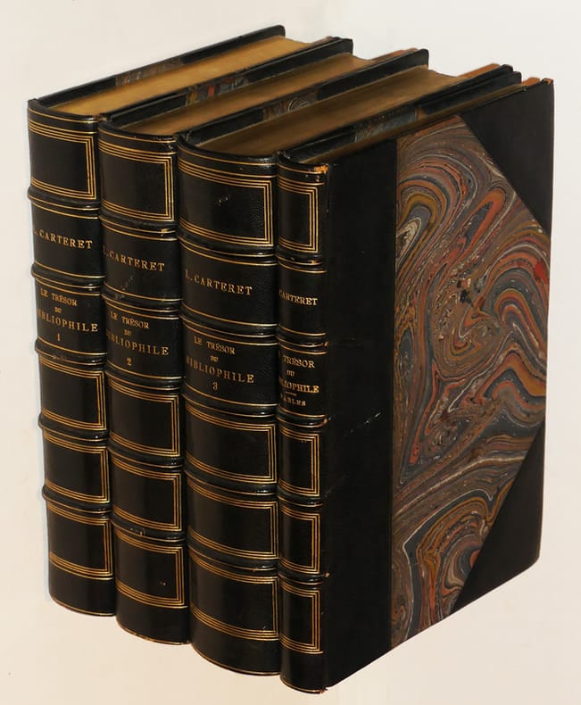 Edition originale. Ouvrage bibliographique de référence pour les belles éditions du XIXe siècle, le fameux Carteret, ouvrage côté, estimé et recherché par les bibliophiles. Les 2 premiers volumes sont consarés aux éditions originales; le troisième, aux livres illustrés, et le quatrième contient les tables et index.