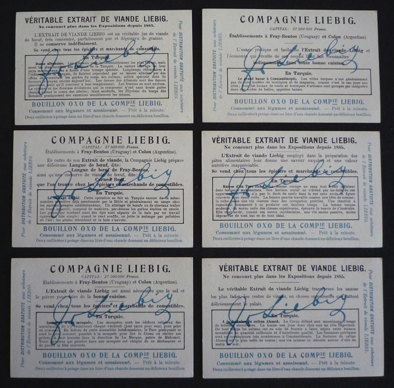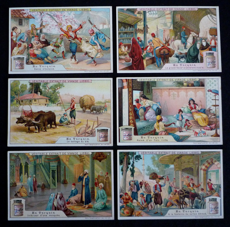 Liebig Chromolithographie "6 chromos publicitaires (11,1 x 7,2 cm) éditées par la marque Liebig, série complète ""En Turquie"" avec l'enveloppe d'origine, comprenant les vignettes suivantes : Danse albanaise ; Le Grand Bazar à Constantinople ; Le battage du blé ; Harem d'un Turc riche ; Intérieur d'une mosquée ; A la fontaine du sultan Ahmed ; petites déchirures sur l'enveloppe, par ailleurs très bon état. Livraison a domicile (La Poste) ou en Mondial Relay sur simple demande."