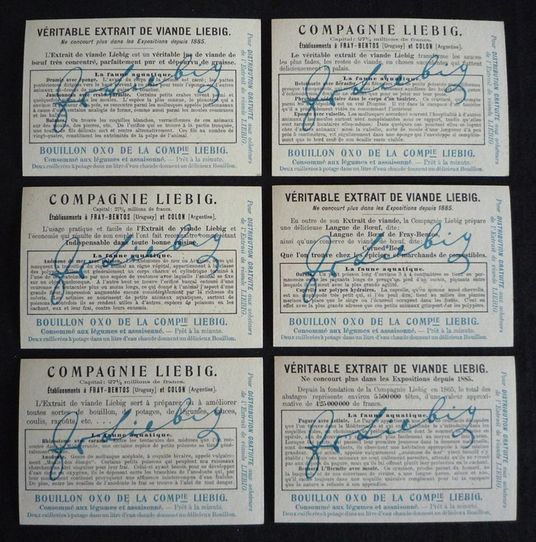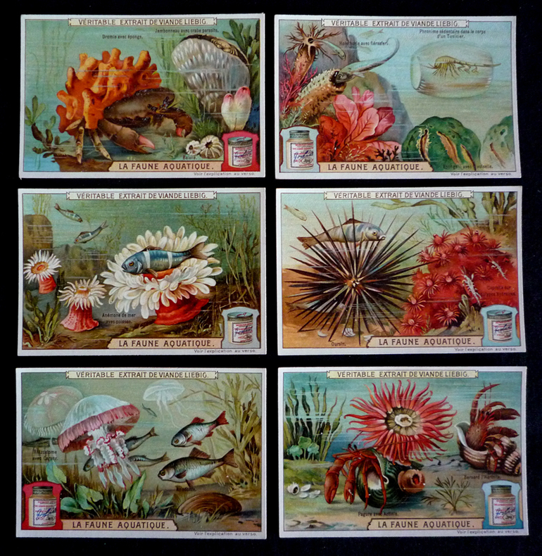 Liebig Chromolithographie "6 chromos publicitaires (10,7 x 7,2 cm) éditées par la marque Liebig, série complète ""La faune aquatique"" avec l'enveloppe d'origine, comprenant les vignettes suivantes : Dromie avec éponge - jambonneau avec crabe parasite - balane ; Anémone de mer avec poisson ; Rhizostome avec Caranx - anodonte ; Holothurie avec fiérasfer - phronime sédentaire dans le corps d'un Tunicier - éponge avec vulselle ; Oursin - caprelle sur polypes hydraires ; Bernard l'hermite - pagure avec actinie ; petites déchirures sur l'enveloppe, par ailleurs bon état. Livraison a domicile (La Poste) ou en Mondial Relay sur simple demande."