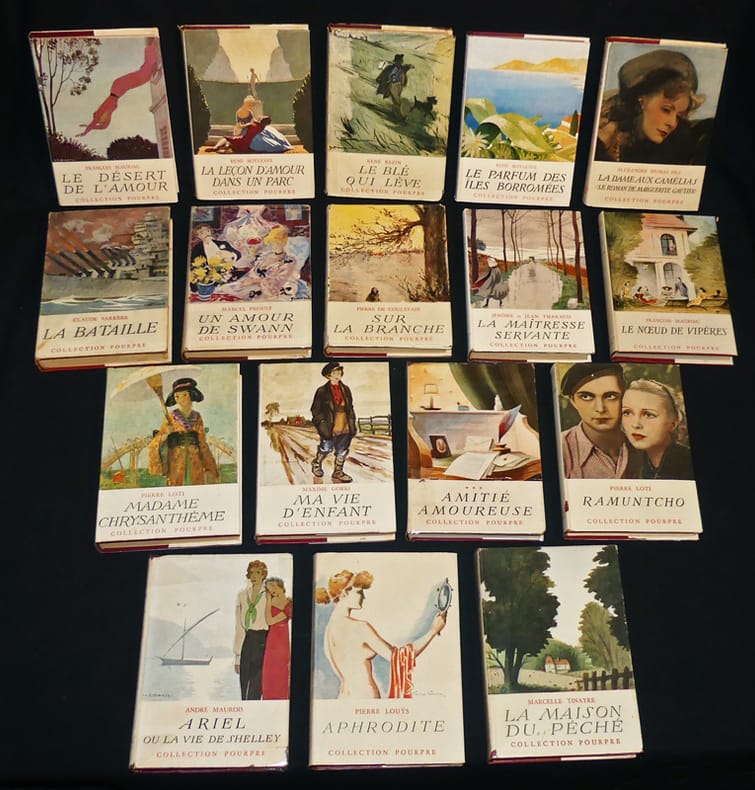 Calmann-Lévy Collection pourpre Reliure d'éditeur avec jaquette 17 volumes in-12 ( 17 x 12 cm.),reliure carton pourpre de l'éditeur sous jaquette illustrée, cette collection a pris naissance en 1938, nos volumes datent des années 40, le nom des illustrateurs des jaquettes n'est pas toujours lisible, ce lot contient les titres suivants : Le désert de l'amour - La leçon d'amour dans un parc - La bataille - Le blé qui lève - Le parfum des îles Borromées - La dame aux camélias - Le noeud de vipères - La maitresse servante - Sur la branche - Un amour de Swann - La maison du péché - Aphrodite - Ramuntcho - Amitié amoureuse - Ma vie d'enfant - Madame Chrysanthème - Ariel ou la vie de Shelley ; menus défauts sur les jaquetes, lot en el état. Livraison a domicile (La Poste) ou en Mondial Relay sur simple demande.
