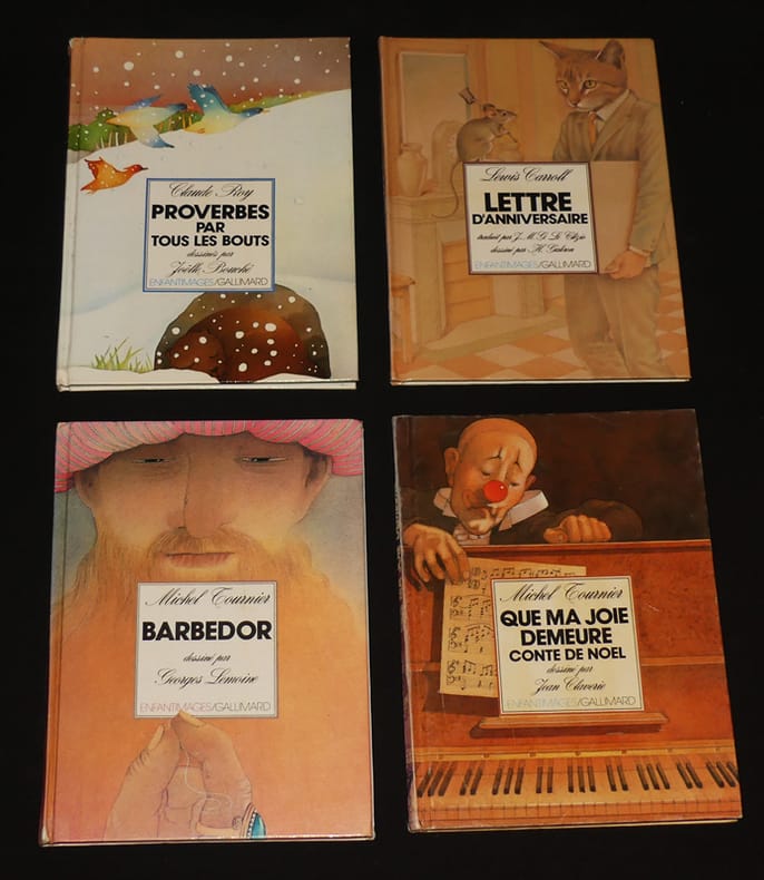 Gallimard Enfantimages Album cartonné Quatre albums in-12 cartonnés ( 20 x 14 cm.), couvertures illustrées, non paginés, une vingtaine de pages par album, largement illustrés en couleurs, ce lot contient ; Proverbes par tous les bouts - Barbedor - Que ma joie demeure - Lettre d'anniversaire, belle collection des années 80 ; des marques jaunes sur un des 4° plat, bel ensemble. Livraison a domicile (La Poste) ou en Mondial Relay sur simple demande.