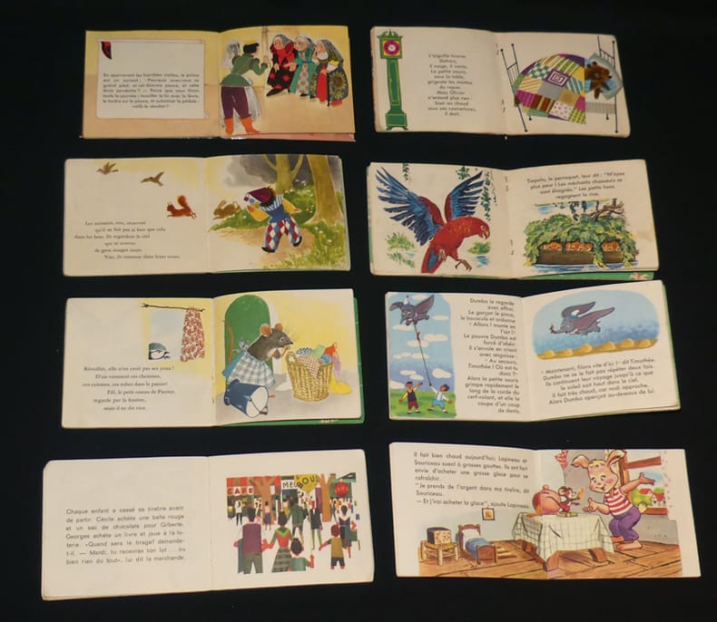 Hachette Mini-Livres Album souple 1963 Huit albums brochés (10 x 11 cm.), ce lot contient : Olivier l'ours savant (1964)-trois petits lions (1969)-Le méchant Arlequin (1963)-Les trois vieilles (1964)-La lessive de Madame Souricette (1965)- Dumbo, l'éléphant volant (1965)- Une glace bien méritée (1968)-Le vélo rouge de Georges (1970) ; dos blanchis et coins usés, ensemble en bon état. Livraison a domicile (La Poste) ou en Mondial Relay sur simple demande.
