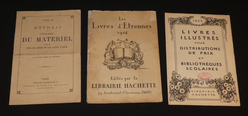 Hachette Plaquette 1878 Trois catalogues au format 24 x 16 cm., ce lot contient : Extrait du catalogue du matériel nécessaire pour les écoles et les salles d'asile, 1878- Les livres d’Étrennes 1924- Livres illustrés pour distribution de prix et bibliothèques scolaires, 1935 ; le catalogue 1924 est réparé au scotch papier, ensemble en bon état. Livraison a domicile (La Poste) ou en Mondial Relay sur simple demande.