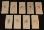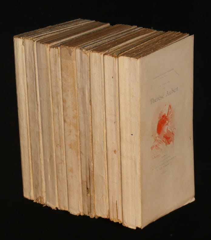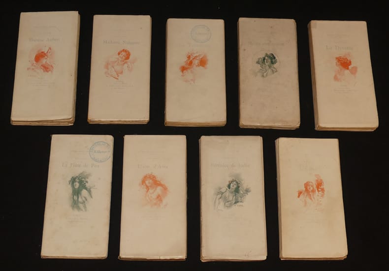Librairie Borel (E. Guillaume) Lotus bleu, Lotus Alba Broché Neuf volumes in-16 brochés (14 x 7 cm.) illustrés de gravures in et hors texte, ce lot comprend : Thérèse Aubert, 1896- Madame Neigeon, 1896-La tentatrice, 1897 (double suite des sanguines)-Myrtis et Korinna, 1897-La Divette, 1896-La flute de pan, 1897 (double suite des hors-texte)-Elem d'Asie, 1897-Bérénice de Judée, 1898-L'Emoi, 1897 (double suite des sanguines) ; fines pliures sur les dos, couvertures un peu salies, petits incidents aux coiffes, ensemble en bon état. Livraison a domicile (La Poste) ou en Mondial Relay sur simple demande.