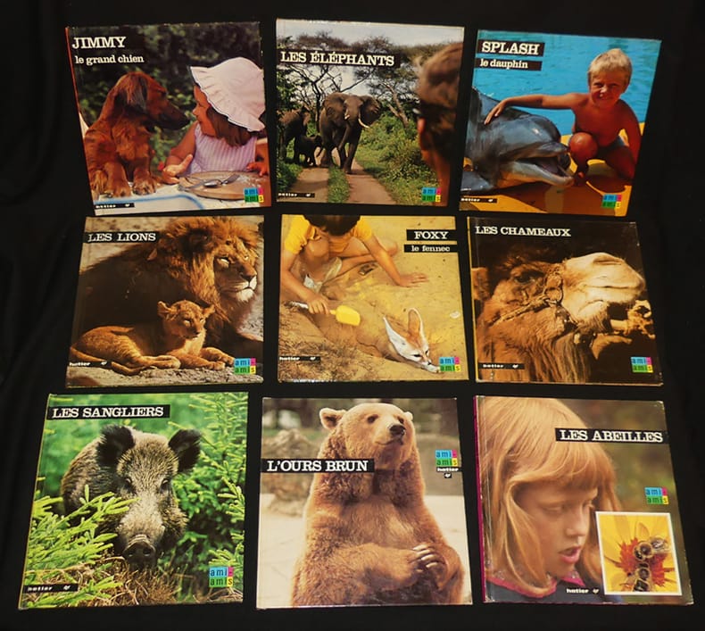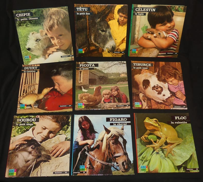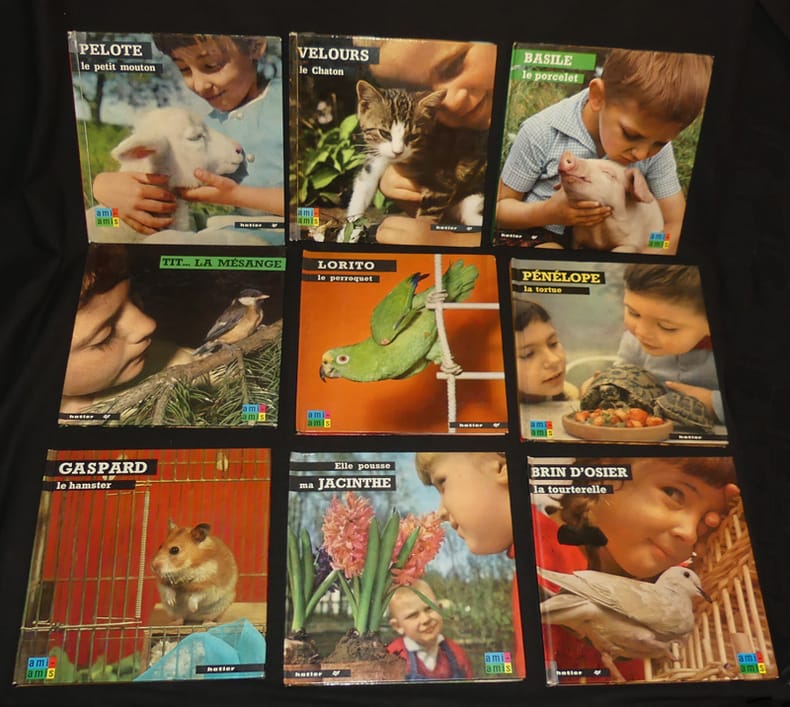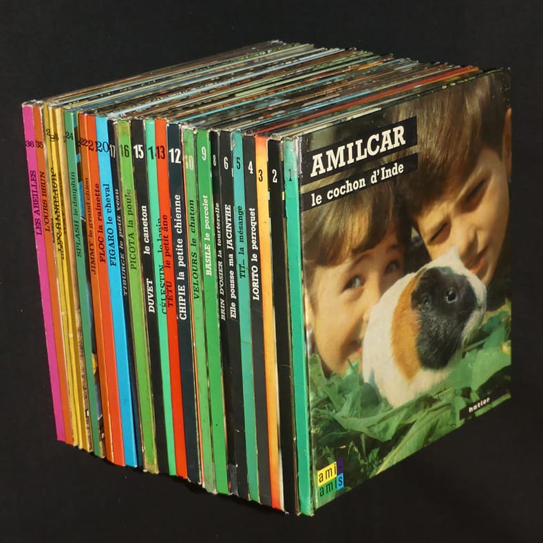 Images de la Nature, Ami-amis album cartonné 1964 28 albums cartonnés in-8 carré (22x22 cm.), les albums vont du numéro 1 au numéro 36 sauf les numéros 7/19/27/30/31/32/33/34, les couvertures sont illustrées en couleurs, 16 pages par album, illustrées de photographies en couleurs et en noir, chaque album est consacré à un animal ou plus rarement une plante et contient une petite histoire, des conseils sur les soins à apporter et des informations d'ordre scientifiques, ce lot comprend : Amilcar le cochon d'Inde - Gaspard le hamster - Pénélope la tortue - Lorito le perroquet - Tit ... la mésange - Elle pousse ma jacinthe - Brin d'osier la tourterelle - Basile le porcelet - Velours le chaton - Pelote le petit mouton - chipie la petite chienne - Têtu le petit âne - Célestin le lapin - Duvet le caneton - Picota la poule - Tiburce le petit veau - Boubou le petit singe - Figaro le cheval - Floc la rainette - Jimmy le grand chien - Les éléphants - Splash le dauphin - Les lions - Foxy le fennec - Les chameaux - les sangliers - l'ours brun - les abeilles ; coiffes frottées et blanchies, quelques traces de scotch, rousseurs habituelles sur les pages de titre, rare ensemble en bon état. Livraison a domicile (La Poste) ou en Mondial Relay sur simple demande.