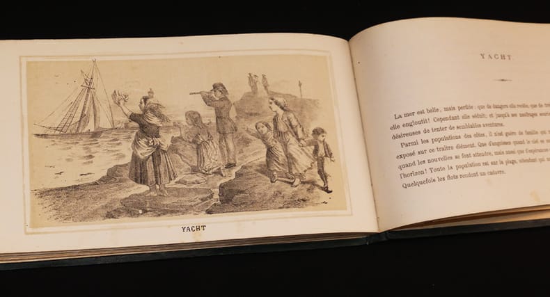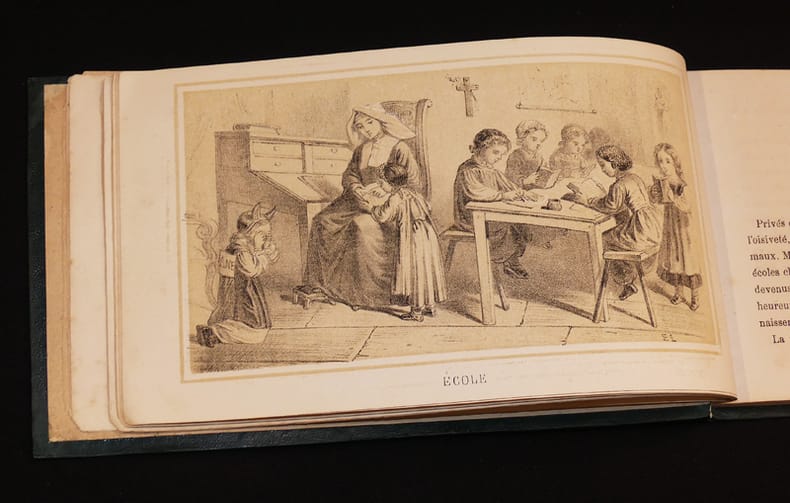 Tournai, Vve H. Casterman Relié 1871 RARISSIME. Album in-12 oblong (23,5 x 13,8 cm), reliure de l'éditeur en toile chagrinée verte, dos renouvelé avec un ajout de papier moderne assorti à la couverture d'origine, double encadrement à froid aux plats, titre doré au premier plat, fer doré représentant une jeune femme à la fontaine au quatrième plat, 85 pages, table sur un feuillet non paginé in fine. Ouvrage orné de 24 lithographies signées E.L., sur fond crème et encadrées, représentant de mignonnes scènes d'enfants pour illustrer chaque mot, de Aumône (illustration en frontispice) à Zouaves (pas de W, et les lettres I et J, représentées par les mots Jeux et Images, sont sur la même page). Mention de deuxième édition au titre, sans doute fictive au vu de la rareté de ce précieux ouvrage (aucun exemplaire référencé dans les bibliothèques). Cet abécédaire a été conçu par Joséphine-Marie de Gaulle (1806-1886), grand-mère du Général de Gaulle et autrice de nombreux livres pour la jeunesse ; quelques traces sur les plats, quelques rousseurs à l'intérieur épargnant les images, bel exemplaire. Livraison a domicile (La Poste) ou en Mondial Relay sur simple demande.