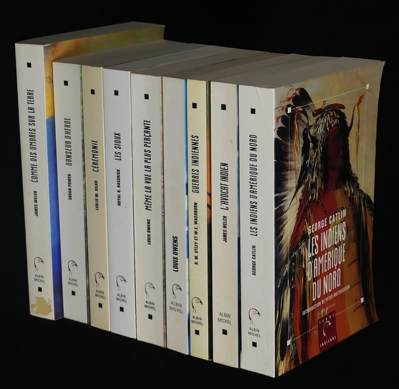 Albin Michel Terre Indienne 9 volumes in-8 brochés,( 23 X 15 cm.), couvertures illustrées, ce lot contient : les Indiens d'Amérique du nord - L'Avocat indien - Guerres indiennes - Le chant du loup - Même la vue la plus perçante - Les sioux vie et coutumes d'une société guerrière - Cérémonie - Danseur d'herbe - Comme des ombres sur la terre ; menus défauts, bel ensemble. Livraison a domicile (La Poste) ou en Mondial Relay sur simple demande.