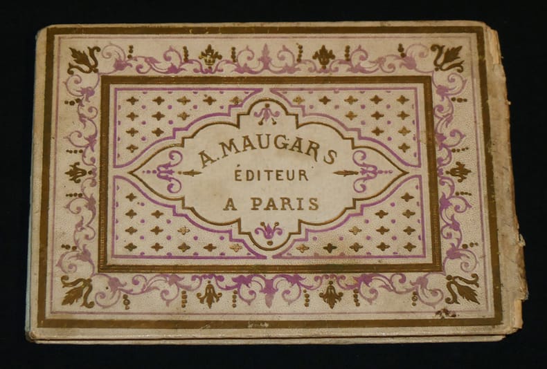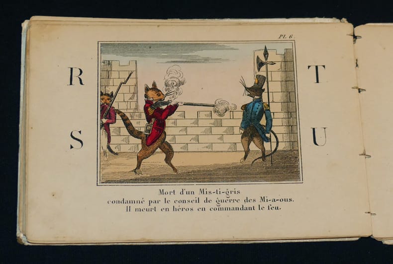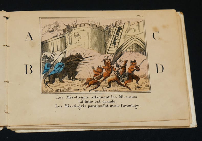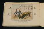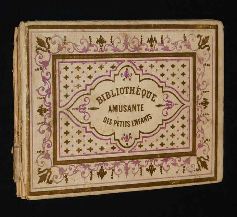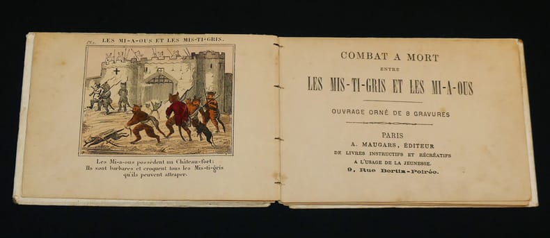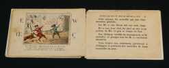 Paris, A. Maugars, éditeur de livres instructifs et récréatifs à l'usage de la jeunesse, 9 rue Bertin-Poirée Bibliothèque amusante des petits enfants Album "Rare album au format imprimé vers 1850 par A. Maugars éditeur de livres instructifs et récréatifs à l'usage de la jeunesse, 9 rue Bertin-Poirée, dans sa collection portant le titre de ""Bibliothèque amusante des petits enfants"" (11.5 * 16.5 cm), 32 pages, 8 planches, cartonnage de l'éditeur de papier à grains blanc, riche décor d'encadrements et de fers dorés et mauves sur les plats, titre de la collection au centre du premier plat, éditeur au second plat, frontispice et sept planches lithographiées, coloriées au pochoir et rehaussées à la gomme arabique. Planches et texte d'une violence extrême ou chats et souris humanisés se décapitent, s'achèvent au canon, à la baïonnette, au sabre... chaque planche est encadrée de quatre lettres de l'alphabet ; dos absent, sinon bon état pour ce rare ouvrage dont la BNF possède un seul exemplaire relié postérieurement, le tampon du dépot légal de la BNF visible sur Gallica nous informe de la date du dépot : 1851. L'ouvrage date donc de cette période. Livraison a domicile (La Poste) ou en Mondial Relay sur simple demande."