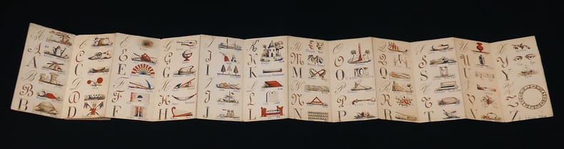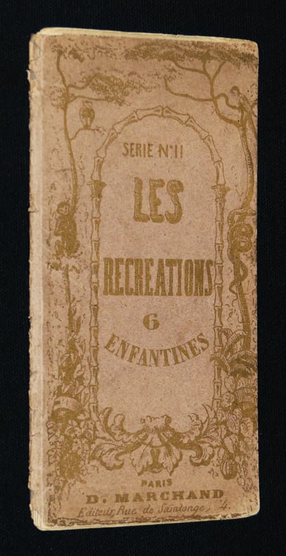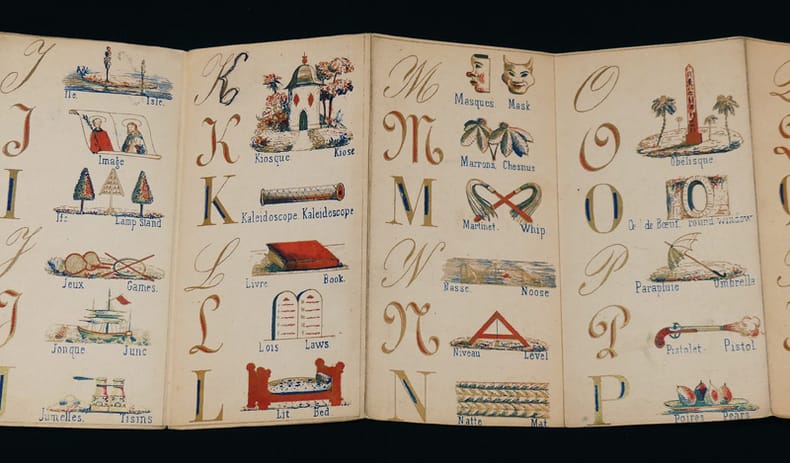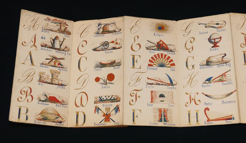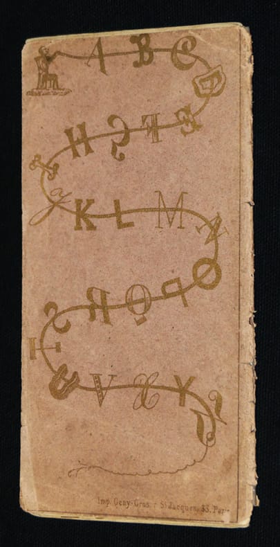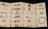 Paris. D. Marchand. Editeur, Rue de Saintonge, 4. Coups de coeur de Bernard Leporello RARISSIME, précieux et délicat petit abécédaire se présentant sous la forme d'un leporello de 12 planches de papier fort sous une fragile couverture de papier rose de l'éditeur. Ouvrage bilingue lithographié à l'or rehaussé de bleu et de rouge. Cinq à six illustrations par page, le plus souvent trois images par initiale écrite en majuscules sous trois calligraphies (typographies). Tous les dessins sont légendés en français et en anglais. Ouvrage non daté (Vers 1870) ; bel état pour ce rarissime et fragile ouvrage. Livraison a domicile (La Poste) ou en Mondial Relay sur simple demande.