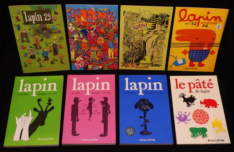 L'Association Dos carré collé "Lapin 30 numéros (Le numéro : Paté de lapin (extraits de lapin de 1 à 5) puis de 6 à 25 puis 27 à 32 puis 37, 38, 41) soit de 1994 à 2010, au total il y aura 43 numéros à sortir de 1993 à 2011. Les fondateurs de cette revue sont : David B., Lewis Trondheim, Mattt Konture, Stanislas, Jean-Christophe Menu, Killoffer et Mokeït. Le numéro 36 consacré au lapin blanc d'Alice au pays des Merveilles n'étant jamais paru. (Le lapin a disparu dans son trou, ou alors il est en retard !). A partir de 2013 la revue renait sous le titre ""Mon Lapin"" et comporte 9 numéro publié jusqu'en 2014. Depuis 2014 sort ""Mon Lapin Quotidien"", le dernier numéro porte le numéro en mars 2025 ; numéros en très bon état. Livraison a domicile (La Poste) ou en Mondial Relay sur simple demande."
