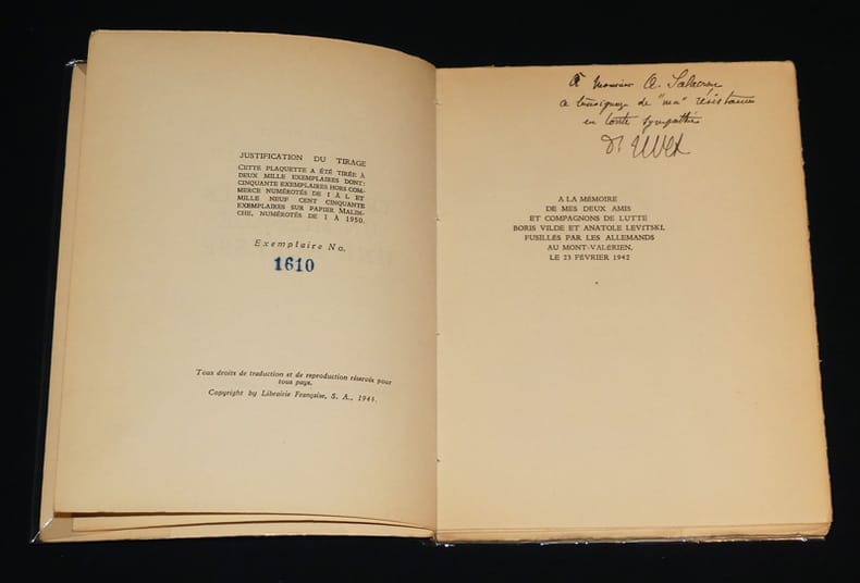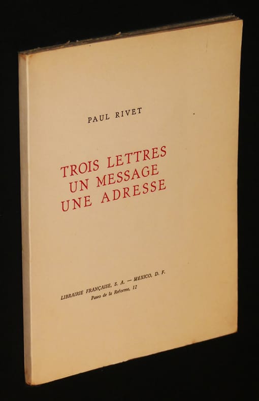 Librairie française, S. A. - Mexico, D. F. Paseo de la Reforma, 12 Broché 1944 "Petit volume broché, (15.4 * 20.7 cm) de 52 pages, tirage à 2000 exemplaires, un des 1950 exemplaires sur papier Malinche après L sur hors commerce, envoi précieux à A. Salacrou : ""A monsieur A. Salacrou ce témoignage de ""ma"" résistance en toute sympathie"" P. Rivet. Aramand Salacrou auteur dramatique français : Mobilisé en 1939, prisonnier, évadé, il participe à des activités de Résistance et s'engage en 1944 dans les Forces françaises libres. Paul Rivet est un médecin et ethnologue français. Il est à l'origine de la création du musée de l'Homme. Antifasciste, il participe à partir de 1940 à la création de la Résistance intérieure française ; bel état. Livraison a domicile (La Poste) ou en Mondial Relay sur simple demande."