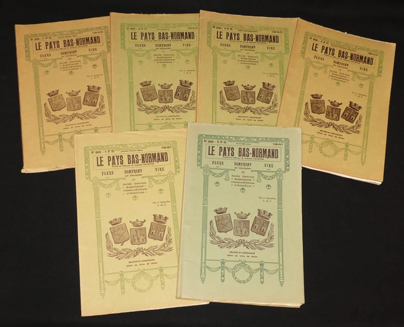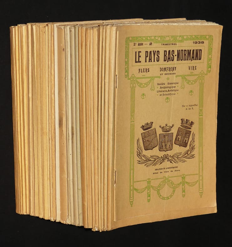 Imp. Jouve et Cie, 15 rue Racine, Paris, Imprimerie Follope, Dron et Garnier, Succrs, Flers-de-l'Orne Broché 1938 "Lot de 31 volumes de cette revue de la ""Société Historique, Archéologique, Littéraire, Artistique et Scientifique du Pays Bas-Normand"" le premier étant le 2nd de la 31e année (1938) et le dernier étant le 1er de la 53e année (N°111, 1960), y manque le 3-4 de la 32e année, le 3-4 de la 35e année, la 36e année et la 37e année (1943-1944), la 39e, 40e et 41e années (1946-1947-1948), le 1er de la 42e année, les 43e, 44e et 45e années (1950-1951-1952). Ce lot comprend donc les numéros suivants à partir 1938 n°2, 3 - 4, 1939 : 1,2,3. 1940 : 64 (premier numéro que nous avons qui suit la numérotation complète de la collection), 65, 66, 67, 1941 : 68, 69, 70. 1942 : 71, 72. 1945 : 771949 le n° 88, 97 à 111 ; les numéros sont en bon état. Livraison a domicile (La Poste) ou en Mondial Relay sur simple demande."
