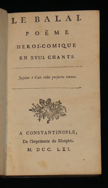A Constantinople, de l'Imprimerie du Mouphti Relié 1761 "EDITION ORIGINALE de ce, in-12 relié pleine basane à dos lisse, dos orné, pièce de titre, faux-titre, titre, XXIV pages d’épître et de préface, puis 216 pages, tranches rouges. L'épitre est dédicacé à l'auteur de la pucelle. L'ouvrage a été écrit par Henri-Joseph Dulaurens, l'édition est anonyme car l'auteur était en disgrace après l'édition des ""Philippiques"" une charge contre les jésuites. Nouvelle édition de ce conte érotique, parodie de la Pucelle d'Orléans de Voltaire L'auteur fut condamné et l'ouvrage : ""le Balai"" mis à l'index en 1825. Mais de son vivant, ayant été dénoncé en décembre 1765 à la chambre ecclésiastique de Mayence, comme auteur d’ouvrages impies, il fut jugé et condamné par sentence du 30 août 1767 à une prison perpétuelle et enfermé dans une maison de pauvres prêtres à Mayence. Il présentait alors des signes de délire. À partir de 1788, il termina sa peine au couvent surveillé de Marienborn, où il mourut à l’âge de 74 ans (1793) ; coins usés, quelques tâches sur les plats, une épidermure à la pièce de titre, bon état. Livraison a domicile (La Poste) ou en Mondial Relay sur simple demande."