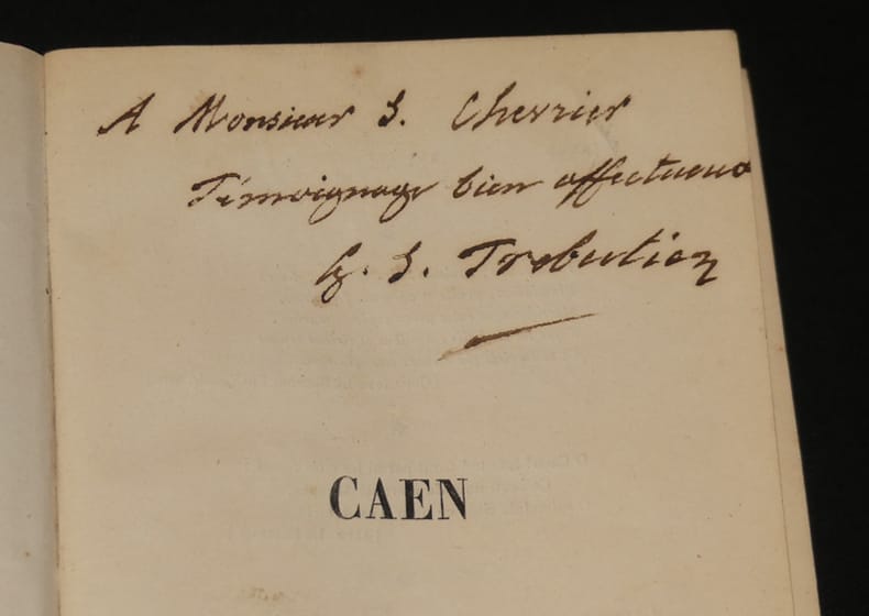 Caen Librairie de A. Hardel, éditeur rue Froiderue, n°2 Relié "Un volume in-12 relié, demi-chagrin rouge, XVI pages de préface, bibliographie et dédicace et 175 pages. Quelques illustrations dans le texte. Titre complet : Caen, précis de son histoire, ses monuments, son commerce et ses environs, guide portatif et complet nécessaire pour bien connaitre cette ancienne capitale de la Basse-Normandie, envoi de l'auteur : ""A Monsieur J. Chevrier, témoignage bien affectueux. G.S. Trebutien"". Une petite plaquette de 14 pages au même format intitulé : In Memoriam, a été reliée in-fine. Elle a été imprimé en 1863 à Caen à l'imprimerie de Domin, hôtel des monnaies. Cette plaquette contient trois textes : à mes deux amis Alph. Le Flaguais et G.-S. Trébutien & à l'Abbé Léon d'Aurevilly signé Alphonse Le Flaguais. Un petit texte de Léon d'Aurevilly et une introduction titré In Mémoriam par Trébutien ; très bon état. Livraison a domicile (La Poste) ou en Mondial Relay sur simple demande."