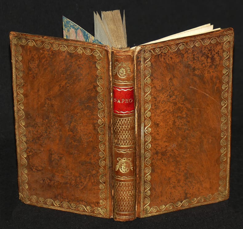 A Londres Relié 1792 "Charmant petit volume (in-16° de 8 * 13 cm) relié pleine basane d'époque à dos lisse, pièce de titre, dos décoré, plat décoré d'une jolie roulette et liserés (voir photo), liseré sur les coupes, frontispice, titre et 146 pages, les 71 premières pages contiennent les ""poésies de Sapho"", de la page 73 à 96 sont imprimées ""les tourterelles de Zelmis"", puis de la page 96 à 146 un ensemble titré ""poésies érotiques"", notes de bas de page, ex-dono en page de garde daté du 2 août 1818 ""Souvenirs d'amitié et de profondes estime de M. (illisible) à une aimable et grande amie (Illisible). 2 août 1818. Ouvrage attribué à Edme-Louis Billardon de Sauvigny ; coiffe supérieur frottée, petites usures d'usage, bon exemplaire. Livraison a domicile (La Poste) ou en Mondial Relay sur simple demande."